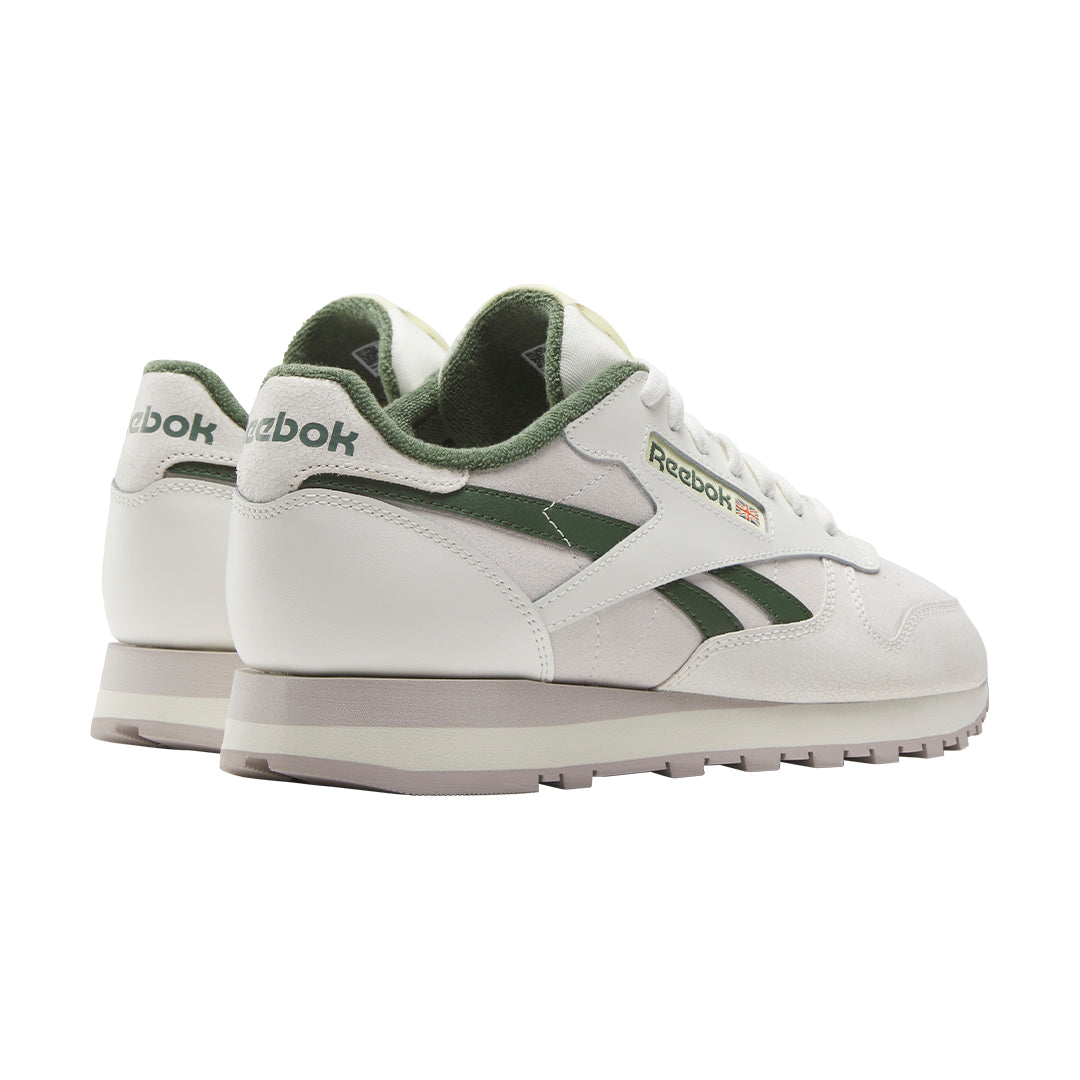 Not pristine. Perfectly worn-in and faded out. These Reebok Classic Leather shoes look like they've been lived in from the color palette to the distressed, cracked details. The upper mixes textures with suede and leather. A distorted tongue label finishes things off.