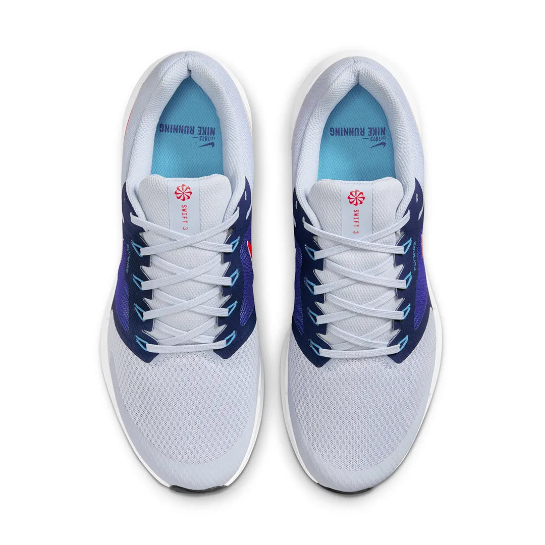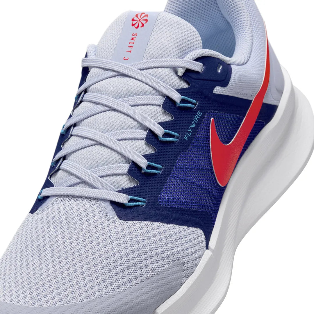 Nike Run Swift 3 Men's Road Running Shoes Flywire cables and plush foam offer a secure, steady ride. No matter the run, the Run Swift 3 helps you get out the door with a modified design thats supportive, durable and comfortable all around. Foam cushioning delivers a soft underfoot feel, while a higher foam height than the previous iteration gives you a plush sensation with every step. Mesh on Upper Mesh on upper adds breathability. Flywire Cables Flywire cables provide a supportive feel when you tighten the laces. Foam Midsole Plush foam midsole cushions each step. Natural Moves Grooves on the rubber outsole help your foot move naturally. More Details