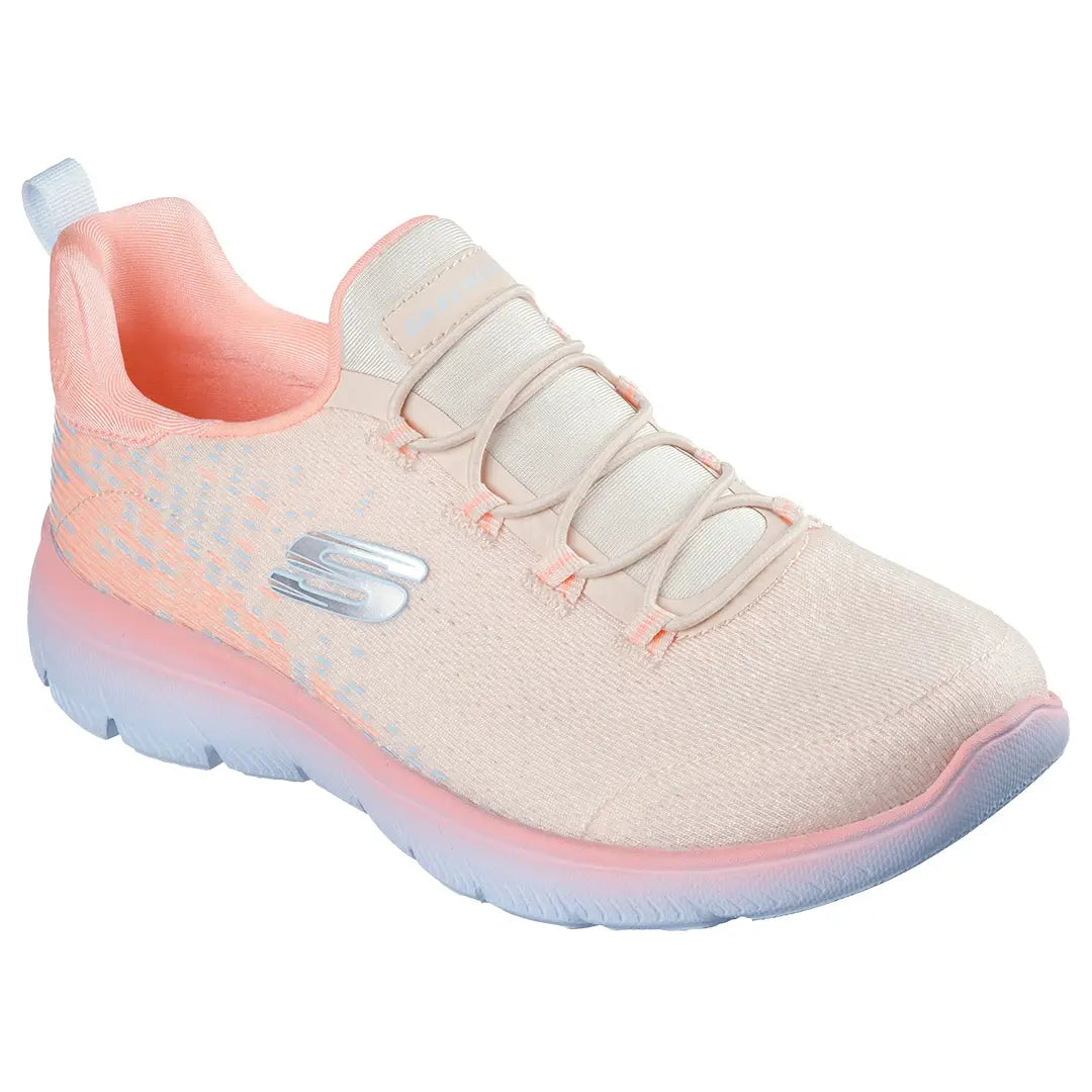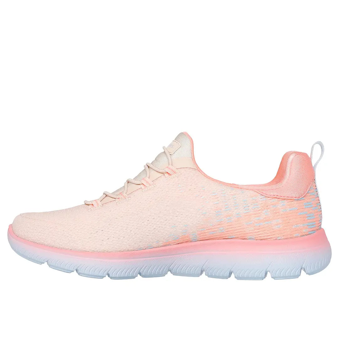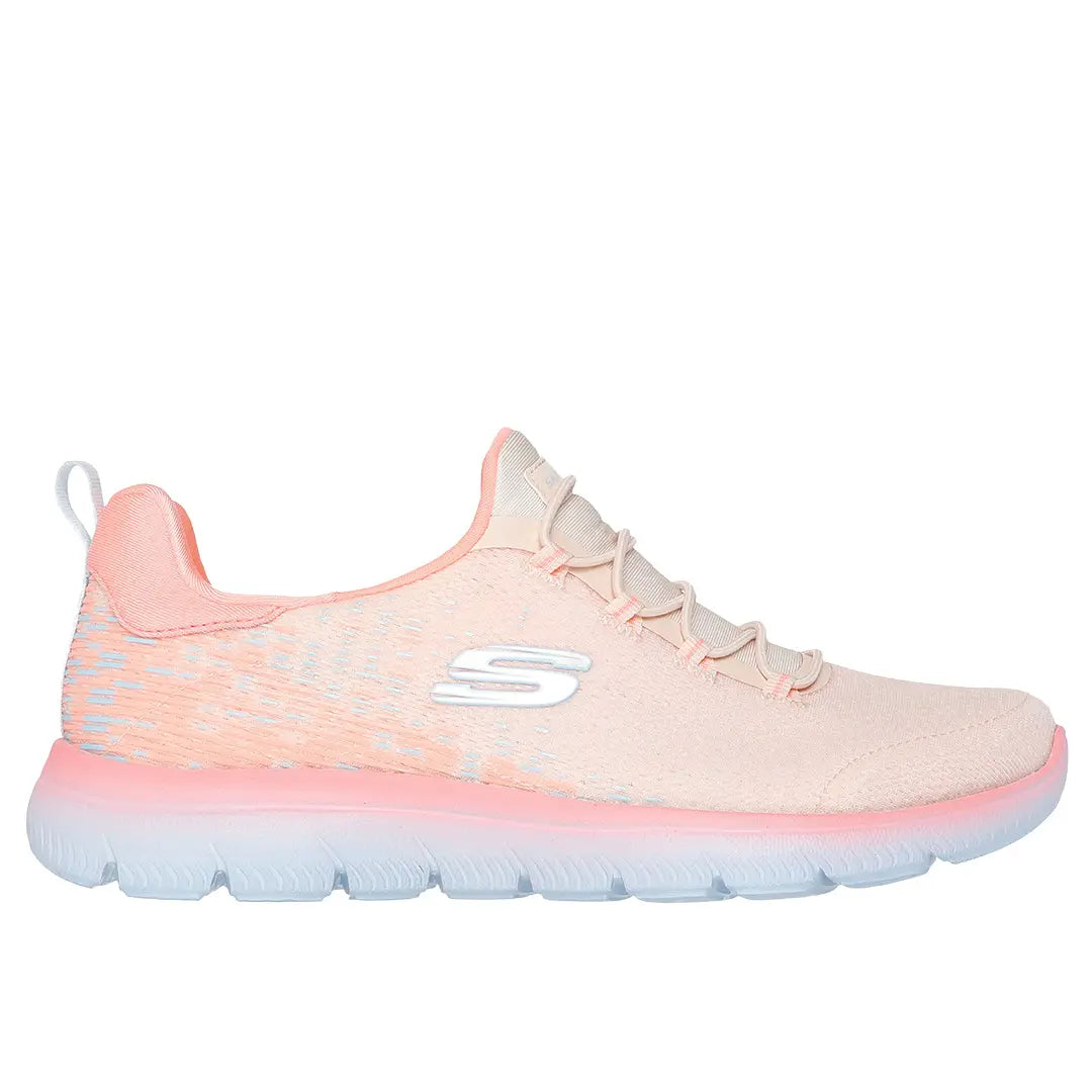 Reach the height of comfort and athletic style with Skechers Summits - Morning Glow. This stretch-laced vegan design features a mono mesh upper and a cushioned Skechers Memory Foam™ comfort insole.