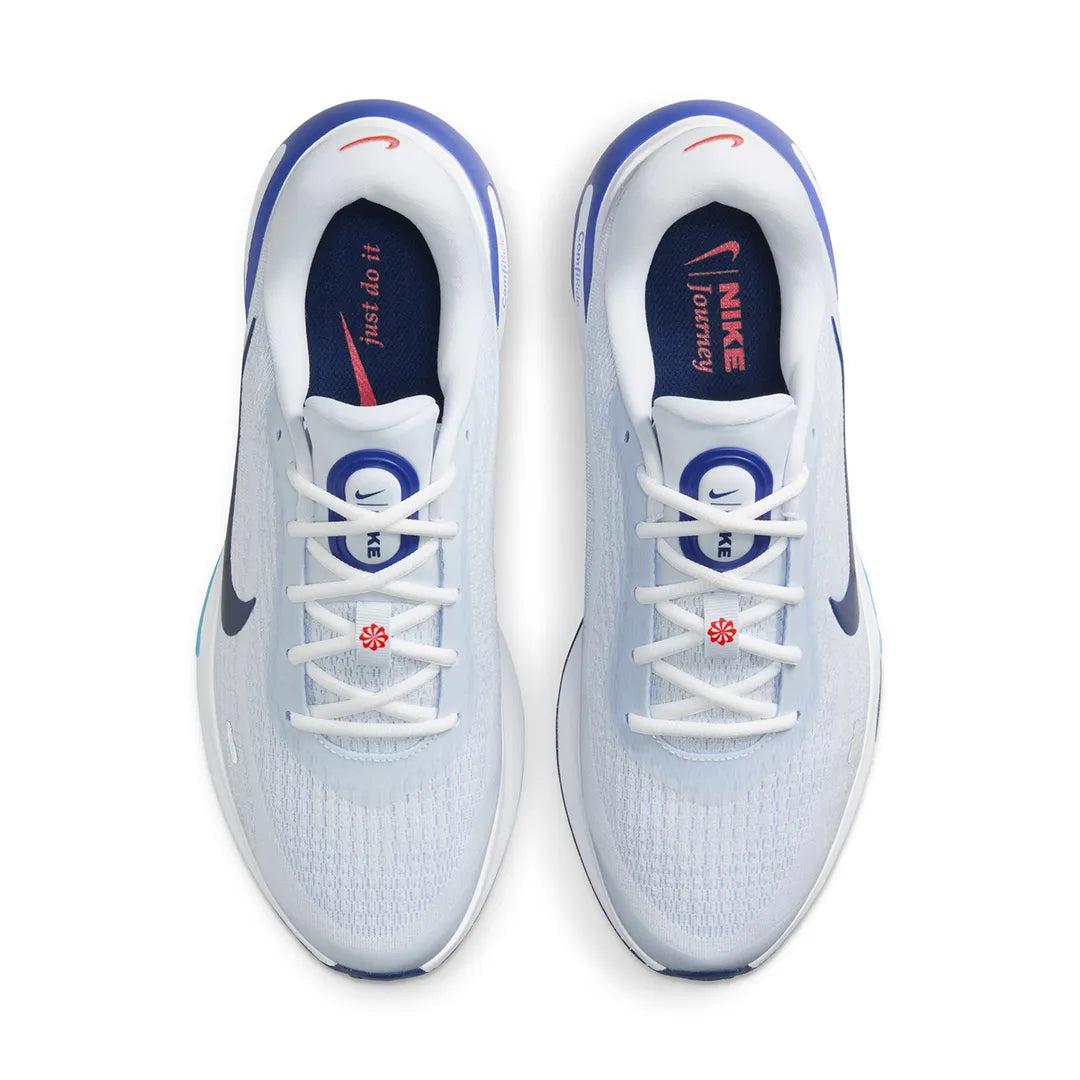 Nike Journey Run Men's Road Running Shoes Enjoy every step, route and jaunt in the Nike Journey Run. Itll have you striding and smiling on punishing pavements, thanks to an extra-high foam stack and supersoft ComfiRide cushioning. It's so comfortable that you'll already be looking forward to lacing 'em up again. Engineered Mesh Upper An engineered mesh upper helps your feet feel secure. Extra Cushion Extra cushioning in the heel and soft touch points in the tongue and collar add comfort to every step. Grippy Traction A rubber outsole provides grippy traction for your miles. More Details
