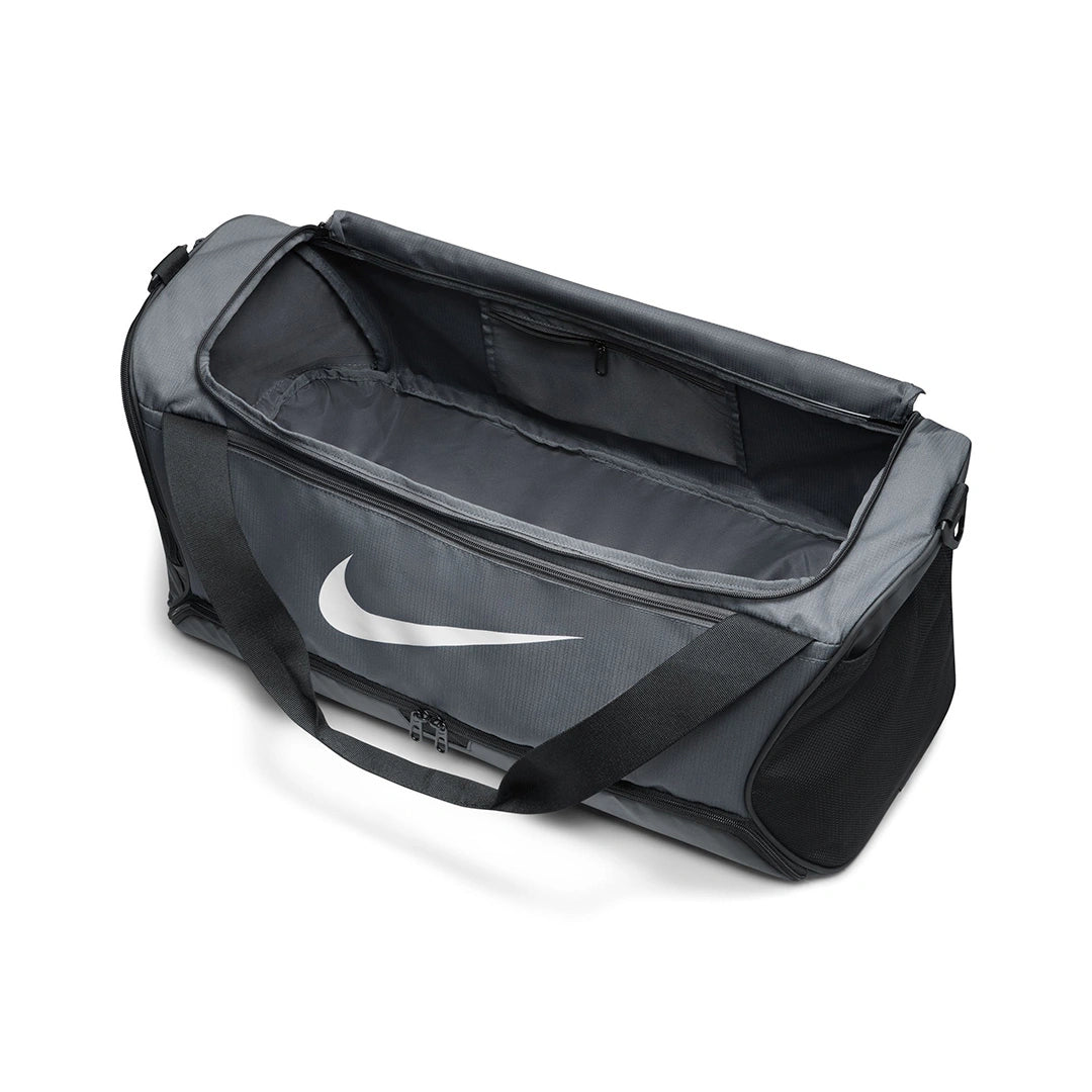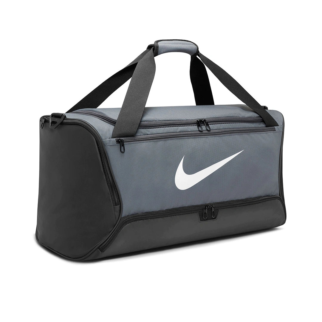 Nike Brasilia 9.5 Training Duffel Bag (Medium, 60L) The spacious and durable Nike Brasilia Duffel Bag keeps all your training gear at hand. A side compartment stores shoes separately, while inner and outer pockets help you stay organized. This product is made with at least 65% recycled polyester fibers. Zippered main compartment secures your training essentials. Zippered inner compartment keeps dirty shoes and sweaty clothes separate from your clean gear. Coated bottom helps shield your things from bumps, scrapes and spills. Outer pockets keep your quick must-haves within reach. More Details