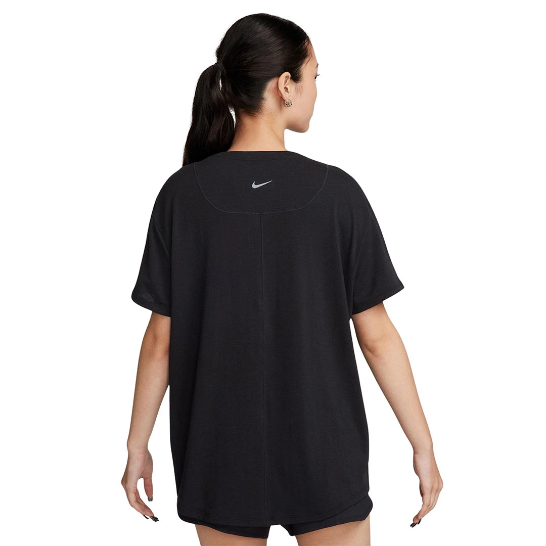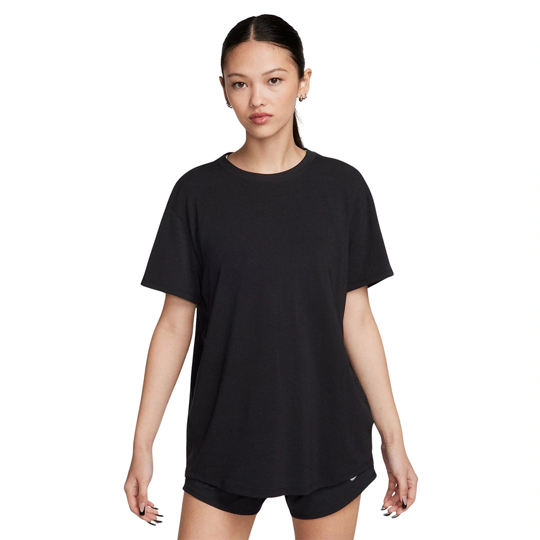 Nike One Relaxed Women's Dri-FIT Short-Sleeve Top Up for a workout or down to chill, this Nike One Relaxed top is ready for whatever you are. Slightly textured, incredibly lightweight jersey fabric dries quickly and drapes you in comfort that goes with any activity. A loose, roomy fit and extended length help keep you covered and cozy from your morning stroll to your evening wind-down—and at all the stops in between. Nike One for All For years, Nike One has been a partner to you on your fitness journey, but we recognize that fitness doesn't look—or feel—the same for everyone. Looking for something more tailored and polished? Check out Nike One Fitted cropped tops. Or try a Nike One Classic top for an easy fit that's still sleek, available in a variety of lengths to meet your needs. All-Day Comfort and Versatility A ribbed neckline enhances the favorite-tee feeling and helps keep the top in place while you move. A longer length is easy to tie up and customize for looks that go with everything you do in a day. Nike Dri-FIT technology moves sweat away from your skin for quicker evaporation, helping you stay dry and comfortable. Curved hem helps keep you covered as you move. More Details