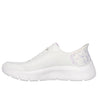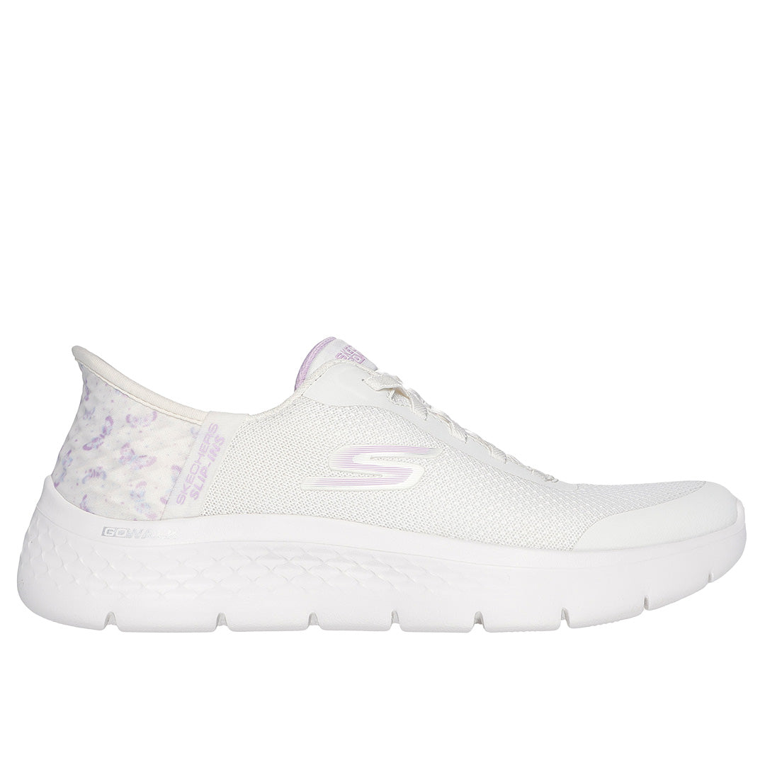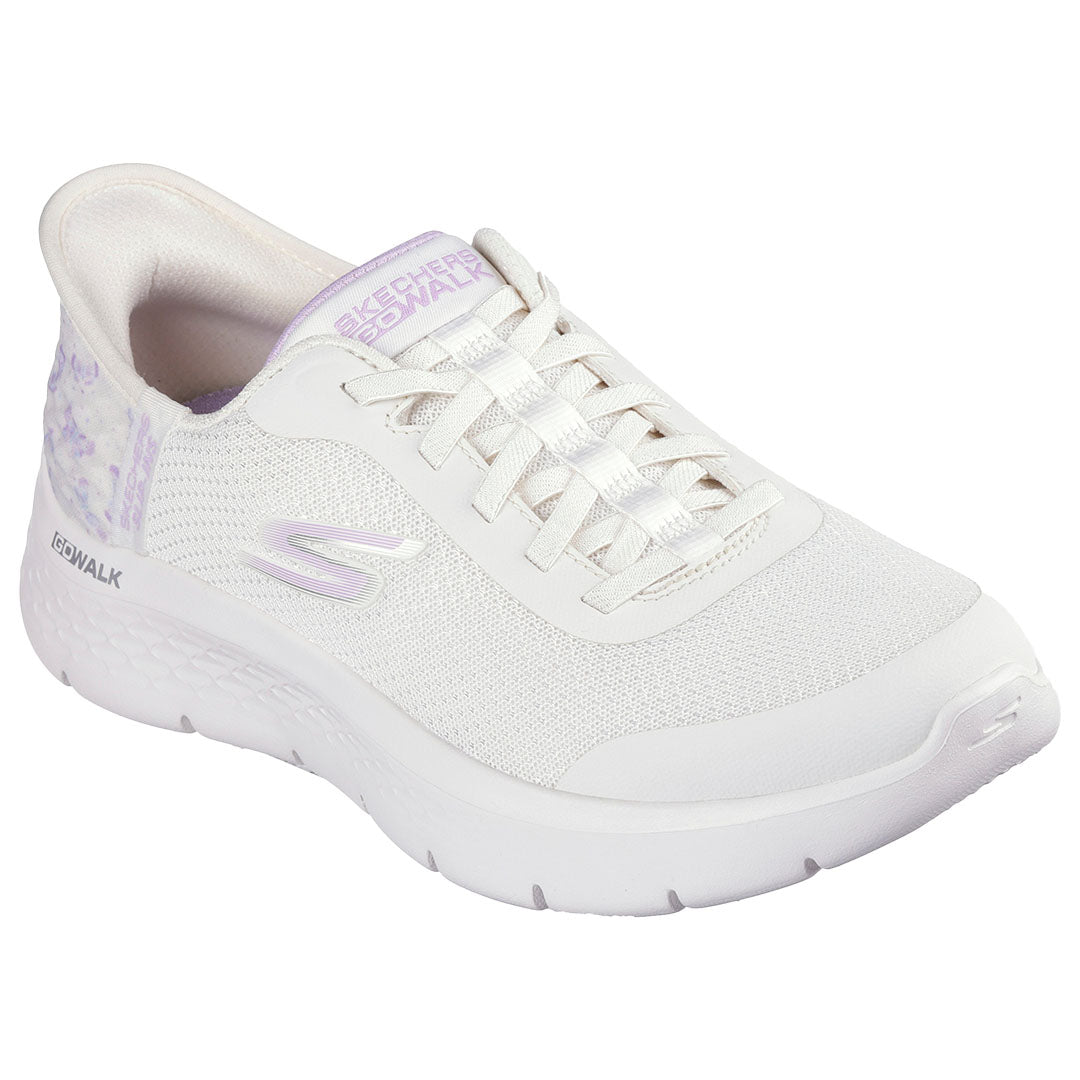 Step-in to convenient walking comfort and cushioning wearing Skechers Hands Free Slip-ins® GO WALK® Flex - Eva. Designed with our exclusive Heel Pillow™, this sporty style features an athletic mesh upper with stretch laces, floral print trim, Skechers Air-Cooled Memory Foam® insole, lightweight ULTRA GO® cushioning, and Flex Pillars™ for added support.