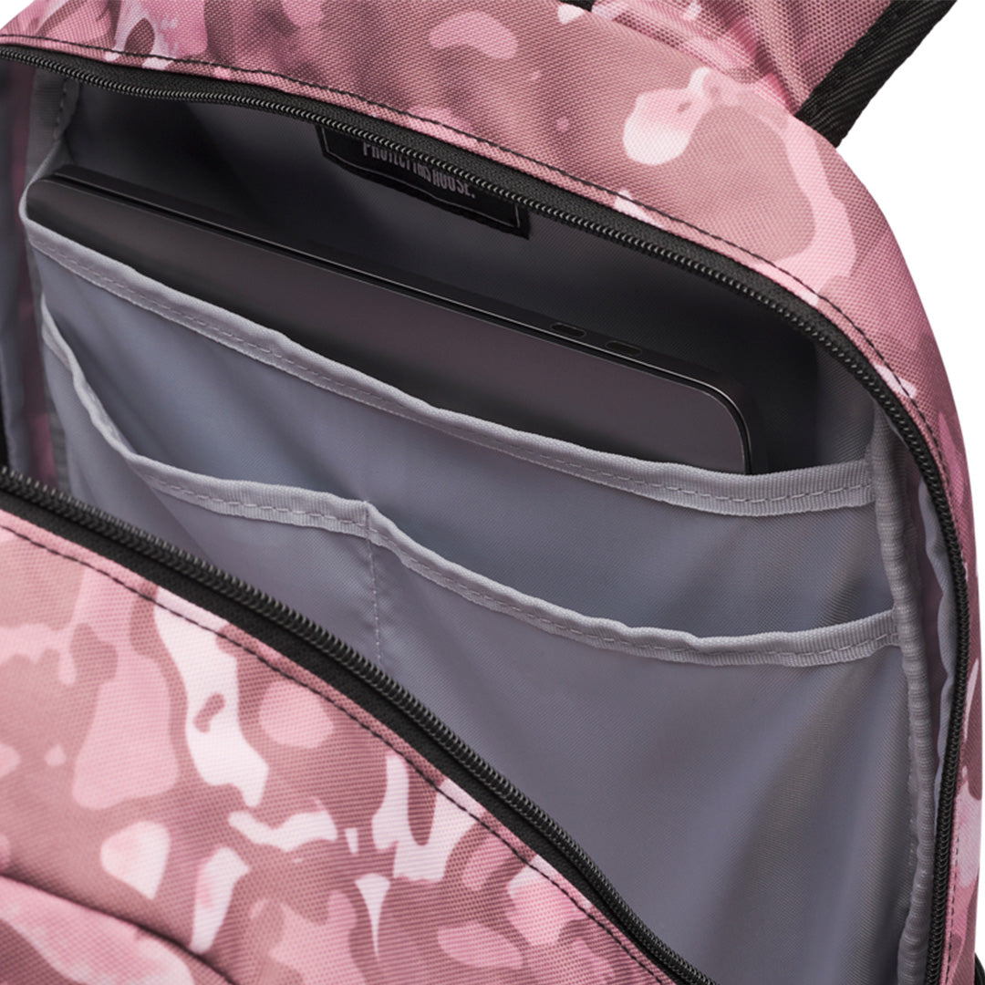 Water-resistant UA Storm technology keeps your stuff dry Padded back panel & shaped straps make it more comfortable to carry Soft-lined laptop sleeve with organization panel—holds up to 15" MacBook Pro® or similarly sized laptop Front sleeve with bungee adjust closure for easily stashing a jacket, pair of shoes or ball Large, zippered front valuables pocket Durable, abrasion-resistant coated bottom
