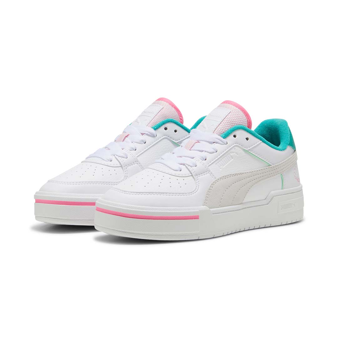 Vacation mode on! This pack is all you need to imagine yourself in a dreamy vacation resort. With summery details such as scalloped edges, terry toweling and retro inspired graphics this pack is the perfect vacay wear. This execution features a synthetic leather base, a suede formstrip, terry towel lining and a printed decorative shell detail on the back quarter panel.