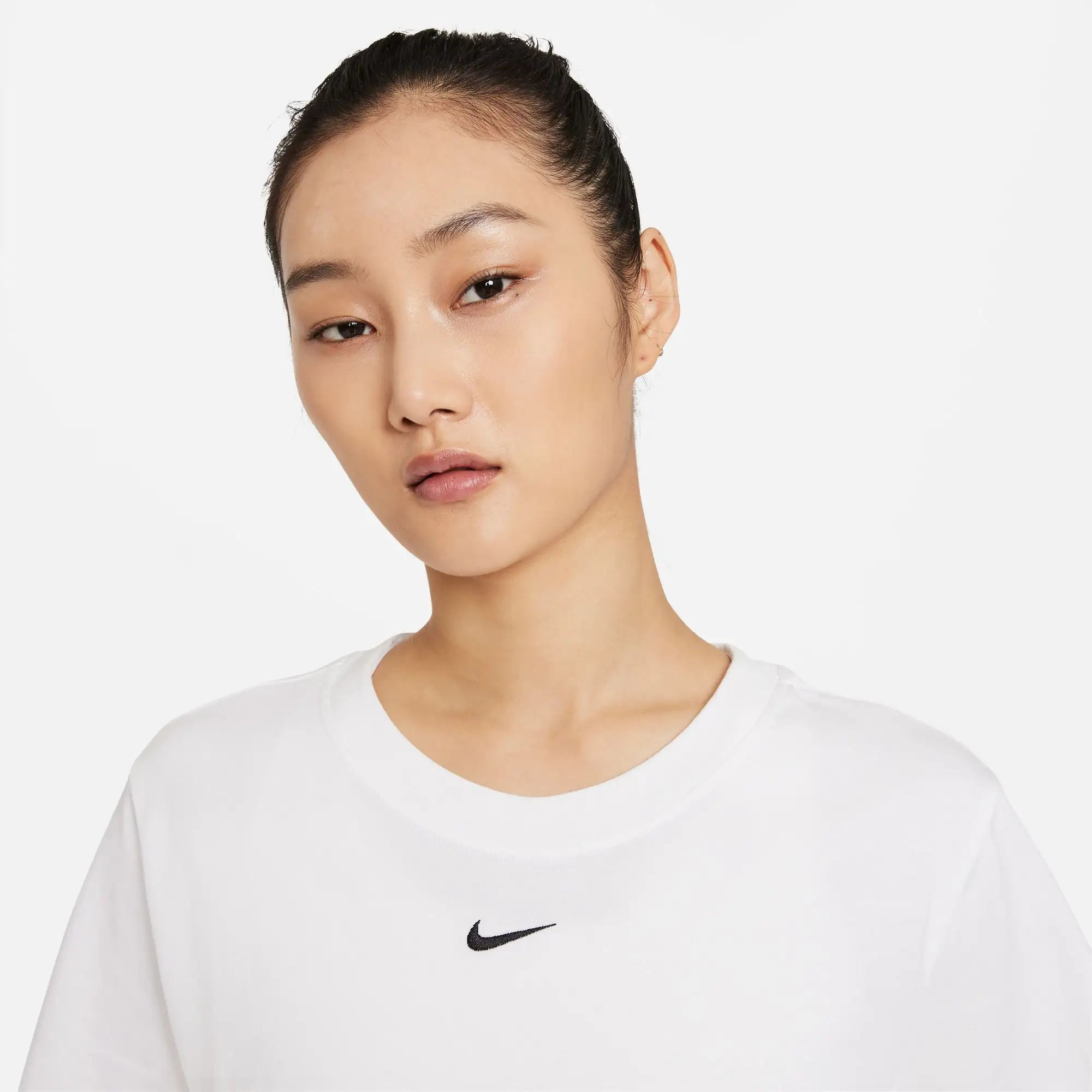 Color: WHITE/BLACK Nike Sportswear Essential Women's Boxy T-Shirt ROOMY TOP WITH A PREMIUM FEEL. Made with our heavyweight cotton jersey, the Nike Sportswear Essential T-Shirt has a soft, premium feel. Its boxy, throwback fit and simple Swoosh graphic make it an easy pick to pair with your favorite leggings or shorts. A roomy fit with slightly dropped shoulders provides a relaxed look without being feeling too big. Heavyweight cotton fabric feels structured and premium. More Details